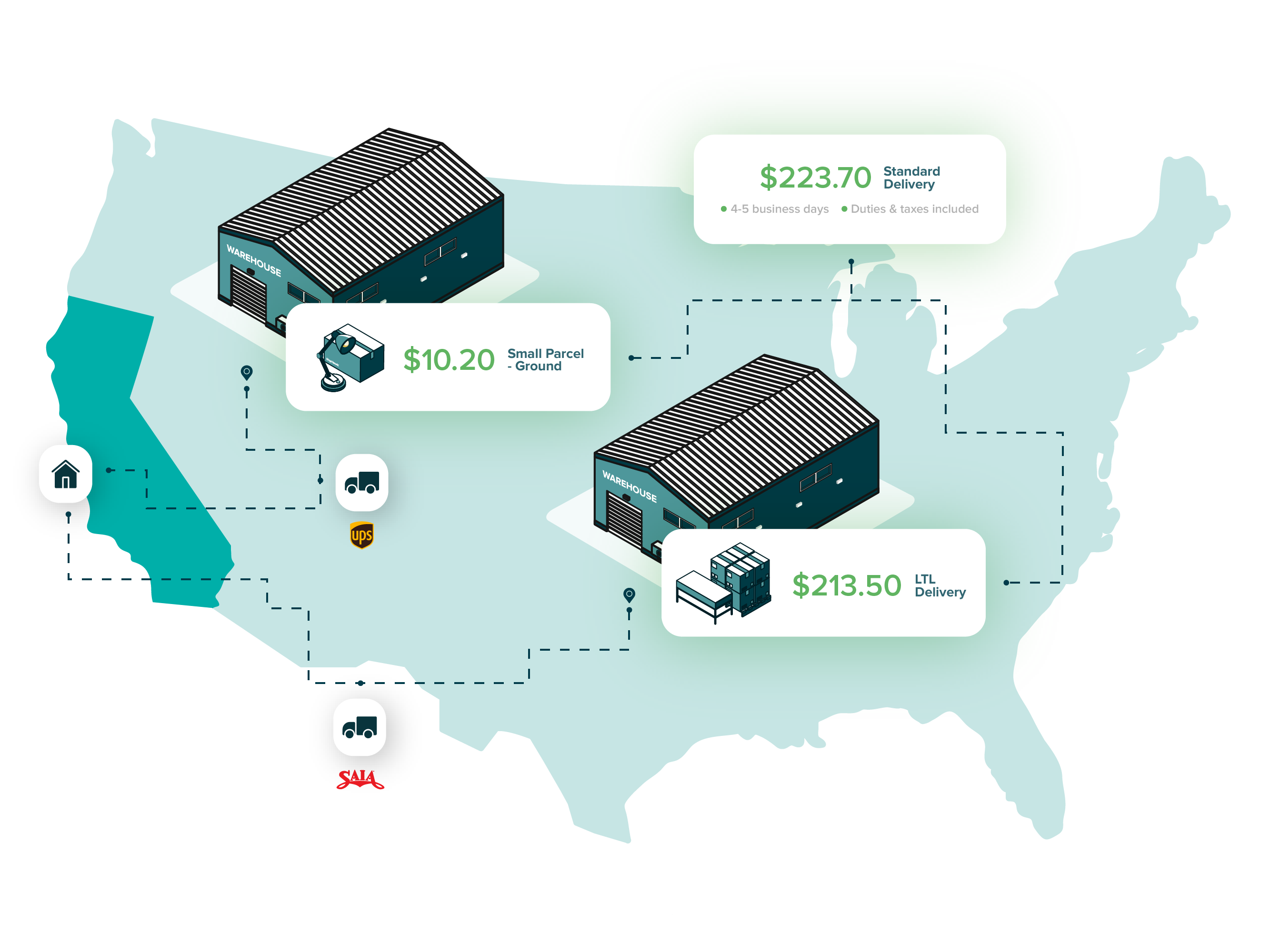 Multi-origin rating from ShipHawk enables you to determine the best warehouse to ship from by looking at your available inventory and the distance between your end customer and the warehouses.