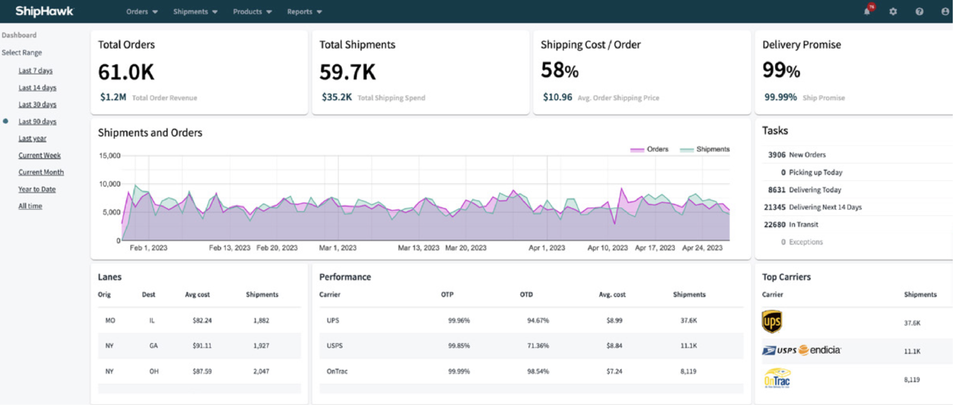ShipHawk Standard Reporting, available in the WMS and TMS solutions, includes metrics that visualize themes like warehouse performance management, shipment cost trends, and on-time delivery impact. All of these reports can be accessed in the platform and summarized to set contacts through email. Examples of the metrics include: